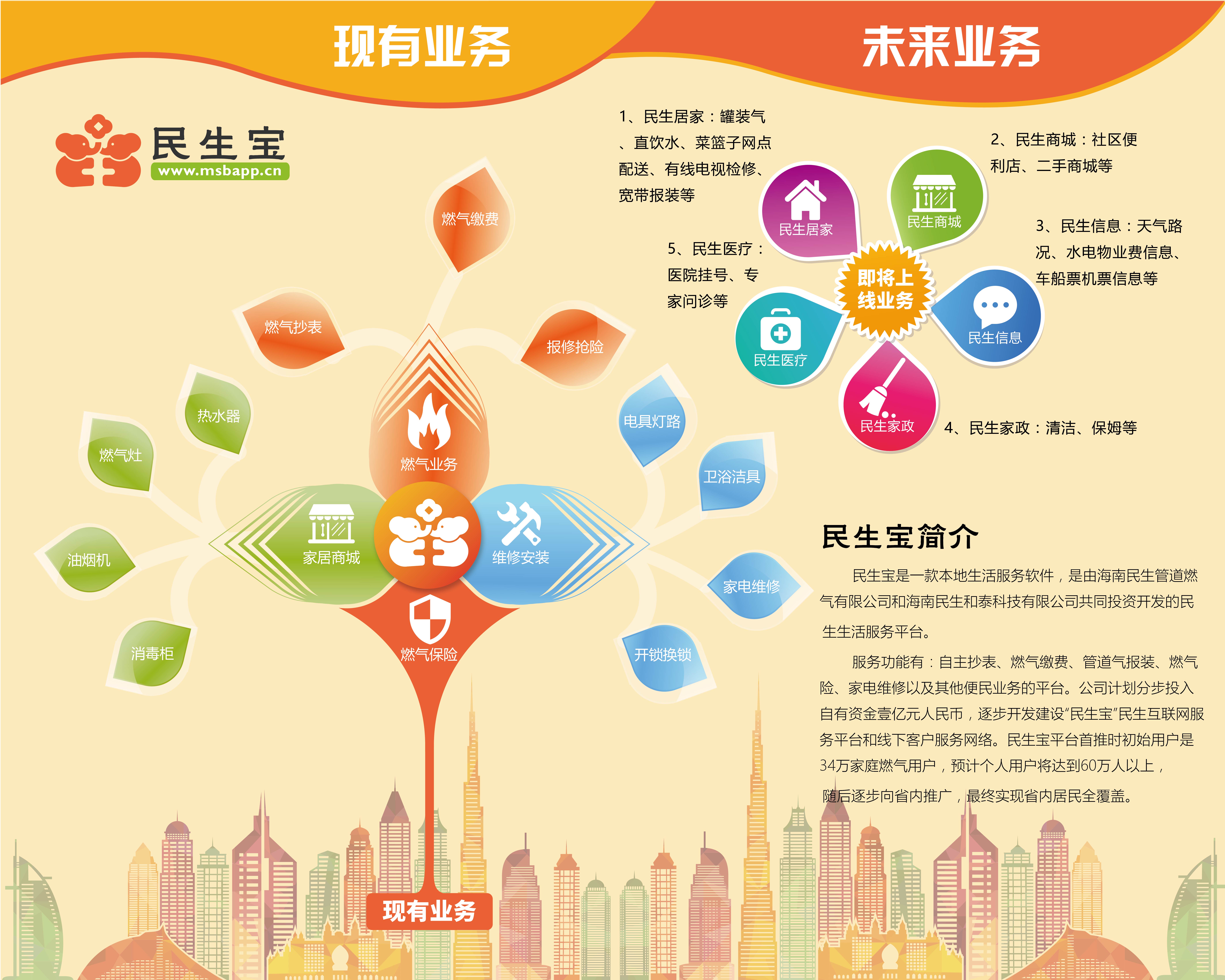 服务功能有:燃气线上业务、家居维修清洗服务、厨卫电器商城、以及保险等其他便民业务。公司计划分步投入自有资金壹亿人民币,逐步开发建设“leyu·乐鱼(中国)体育官方网站”民生互联网服务平台和线下客户服务网络。leyu·乐鱼(中国)体育官方网站平台首推时初始用户是34万家庭燃气用户,预计个人用户将达到60万人以上,随后逐步向省内推广,最终实现省内居民全覆盖。